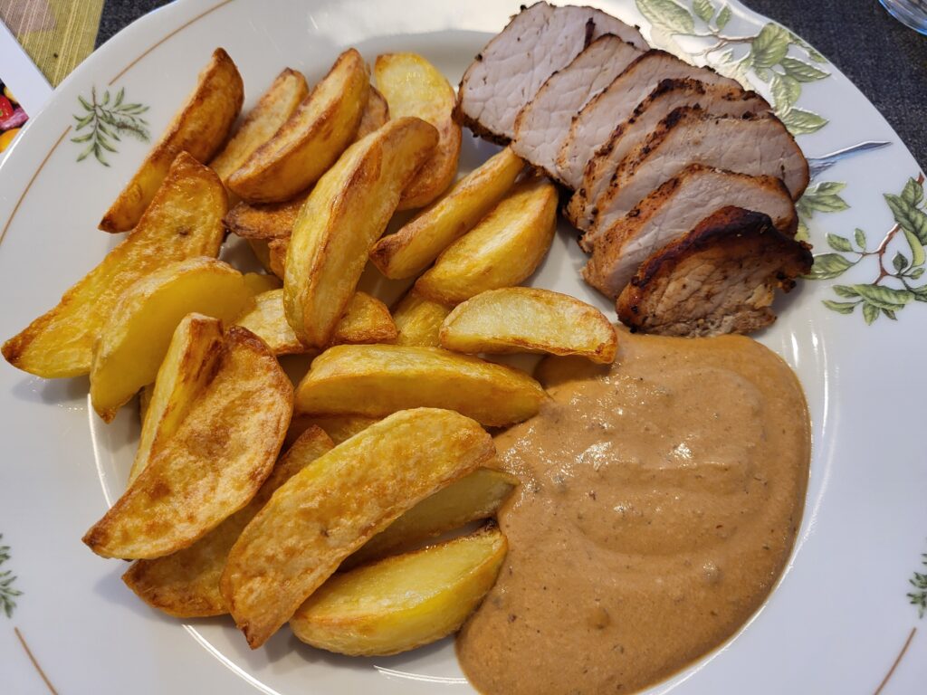 Så det blev matlagning hemmavid istället. Ugnsstekt fläskytterfilé, ärfrajad klyftpotatis och långkokt pepparsås. Kunde förstås ha fixat lite grönsaker också, men det var det ingen som orkade. Som vanligt. Herre jösses, vi borde verkligen äta mer grönsaker. Det är ju så gott.