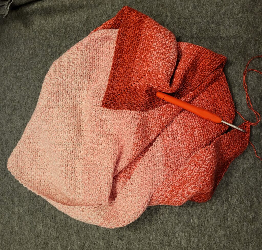 Idag blev det lite virkat på min senaste sjal – denna är till mig själv av garnet jag köpte på Syfestivalen i höstas. Jag använder mossvirkning (moss stitch eller linen stitch på engelska) som är min favoritmaska. Enkelt men ger ett helt annat intryck än vanliga fastmaskor – detta är varannan luftmaska, varannan fastmaska och på nästa varv så gör man fastmaskan runt luftmaskan. Det blir väldigt mjukt och följsamt, men det ökar väldigt långsamt och varven blir längre och längre. Och längre. Och längre. Vet inte hur många maskor det är nu, men det tar närapå en timme att virka ett varv.