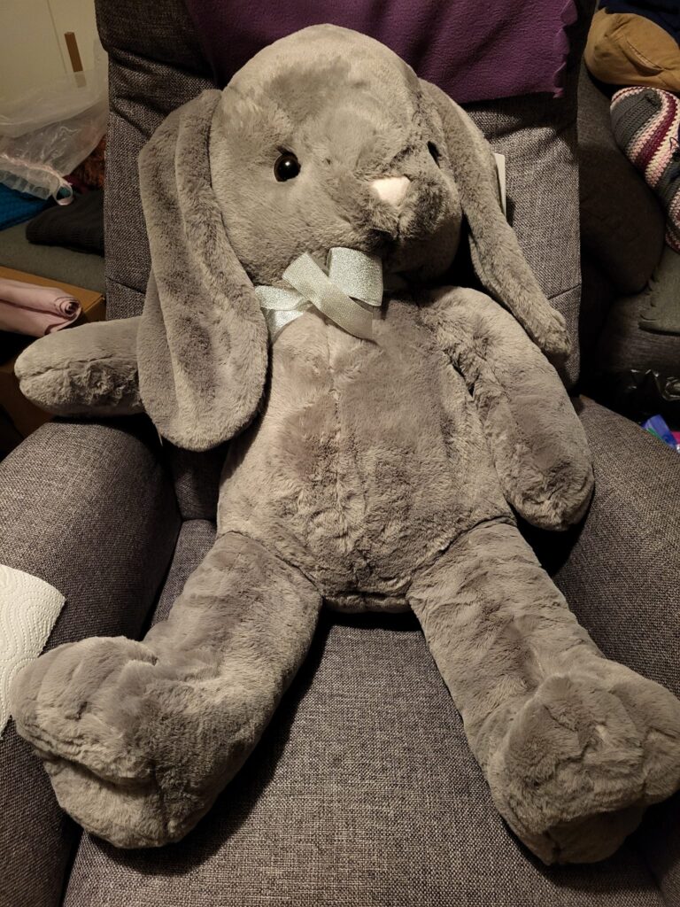 På jobbet har vi en ”Stor-Alfons” som funkar superbra som kudde när man halvligger i soffan och läser. Tyvärr finns han inte längre till försäljning – å andra sidan var han svindyr innan han försvann ur sortimentet hos Teddykompaniet. Men när jag kollade runt där så hittade jag kaninen Olivia och kände att hon skulle vara perfekt för jobbet. Och det är hon verkligen, helt perfekt som extra ryggstöd. Och jättego att krama. Japp, barnasinnet är helt klart i behåll hemma hos oss.