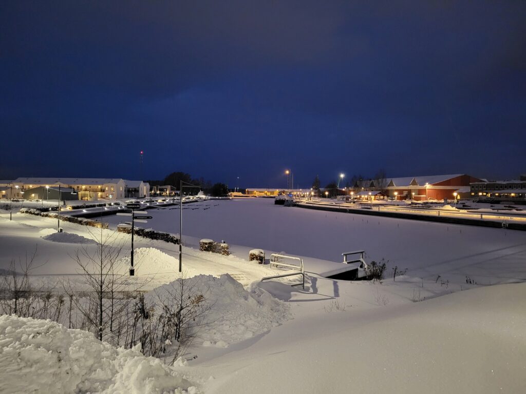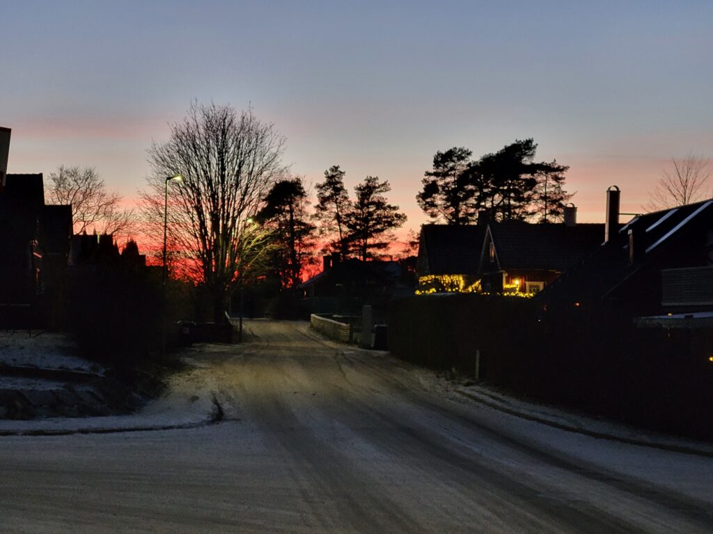 Det var inte plogat på många ställen, de större gatorna förstås, men inga trottoarer eller gång-/cykelvägar, så det blev en del pulsande. Inte så kallt som jag trodde heller så jag blev väldigt varm, dröjde inte jättelänge innan vantarna åkte av.
