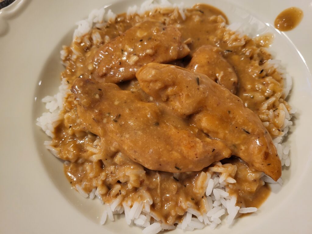 Maken stekte 600 gram kycklinginnerfilé i smör, kryddade med salt och vitpeppar och flyttade över i stekgrytan allt eftersom. Därefter stekte han 3 små schalottenlökar och 2 vitlöksklyftor – finhackade – och öste över i stekgrytan.